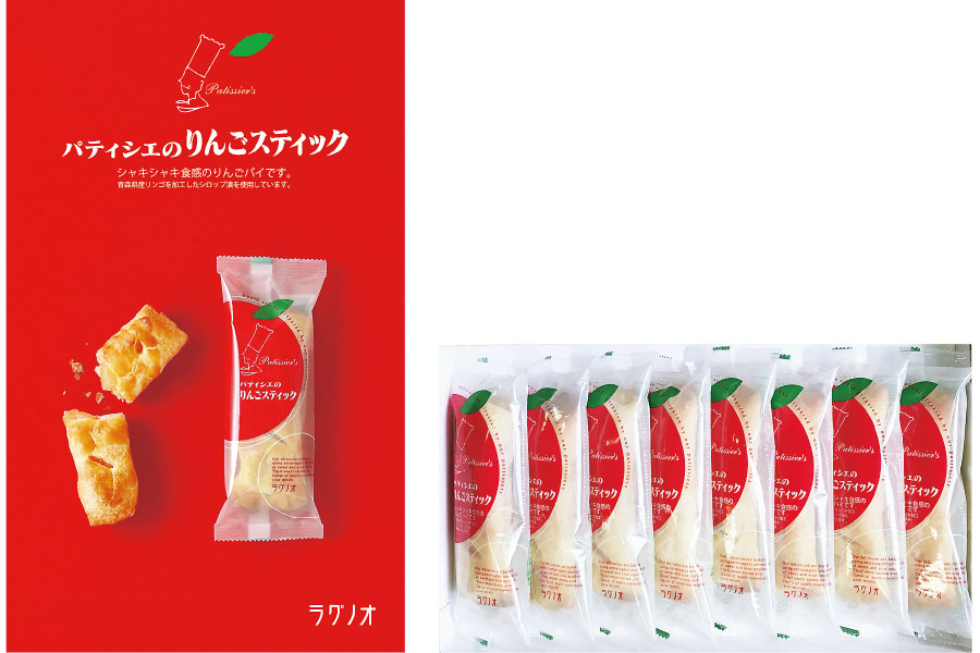 青森県産リンゴのシロップ漬けを大きめにカットしスポンジ生地と一緒にパイで包み焼きあげました。果肉のシャキシャキ感としっとりとしたパイの食感が特長のスティックタイプのアップルパイです。